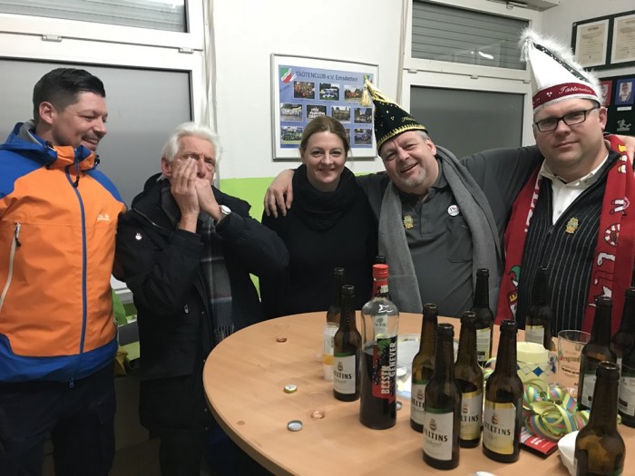 Aufgrund der sehr kurzen Session und der damit verbundenen Termindichte kombinierten wir in diesem Jahr das Wagenbekieken mit unserer Vorparty. Los ging es am 13.01.18 ab 15:00 Uhr in der Wagenbauhalle. Neben den gewohnten Heiß- und Kaltgetränken gab es auch Waffeln und Grillwürstchen. Nachmittags noch gut besucht; gestaltete sich der Übergang zur Party aufgrund mangelnder Beteiligung - auch wegen Alternativterminen wie SPORTISSIMO - eher schleppend. Dennoch hatten die, die da waren jede Menge Spaß und feierten bis in die späten Stunden.
